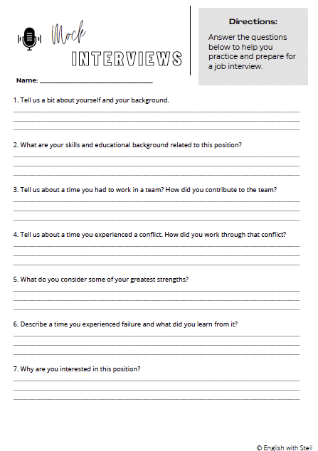 To personalize the learning experience, the unit includes a worksheet filled with practice interview questions. Students are encouraged to reflect on and craft their answers, enabling them to develop thoughtful, authentic responses. This exercise not only aids in self-reflection but also helps students articulate their skills, experiences, and aspirations effectively.